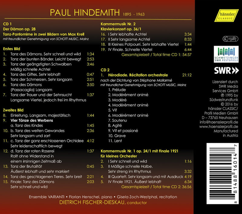 Haenssler ClassicHindemith: Der Damon, Herodiade, Kammermusik Nos. 1 & 2 / Fischer-Dieskau, Ensemble Varianti