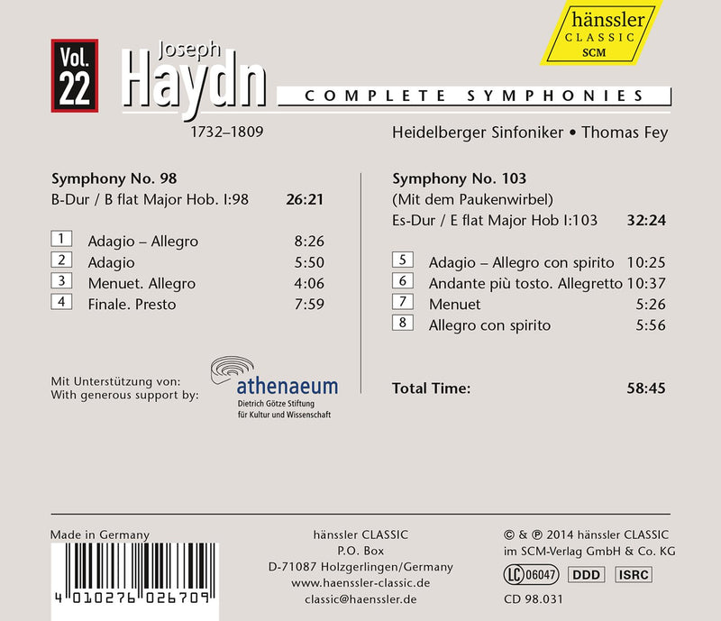 Haenssler ClassicHaydn: Complete Symphonies, Vol. 22Haydn’s Symphonies Nos. 98 and 103 come from his set of 12 "London" symphonies, written at the height of his mastery and...