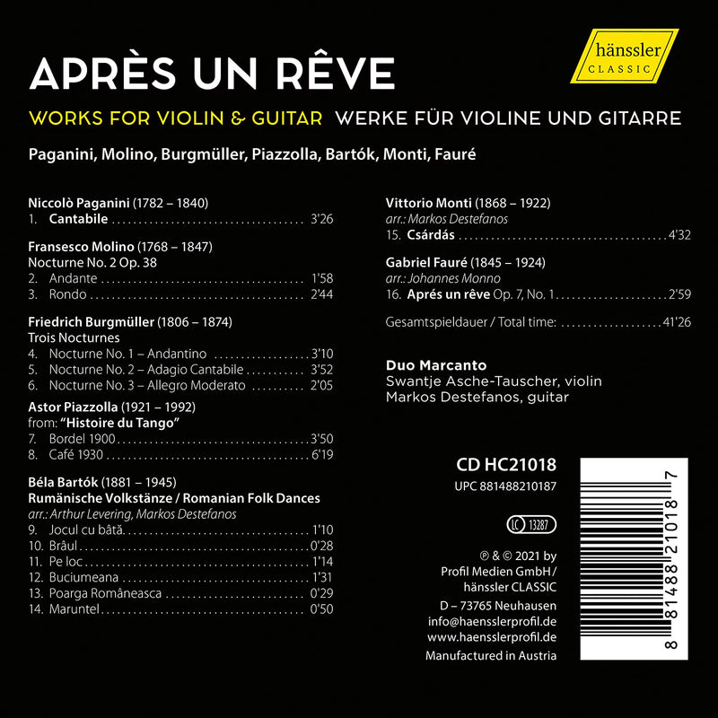On SaleHaenssler ClassicBartók, Fauré, Paganini, Piazzolla: Après un Reve - Works for Violin and Guitar / Duo Marcanto
