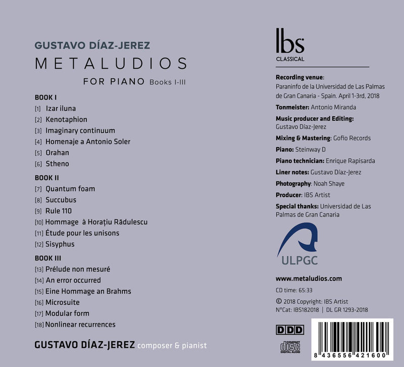 IBS ClassicalGustavo Díaz-Jerez: Metaludios, Books 1-3Of his new release pianist Gustavo Díaz Jerez writes: “The Metaludios are relatively short works grouped in books of six pieces. In...
