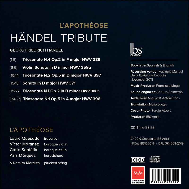 In their last recording project Handel Tribute, L'Apoth�ose pays homage to the great composer by performing six chamber music top pieces chosen...