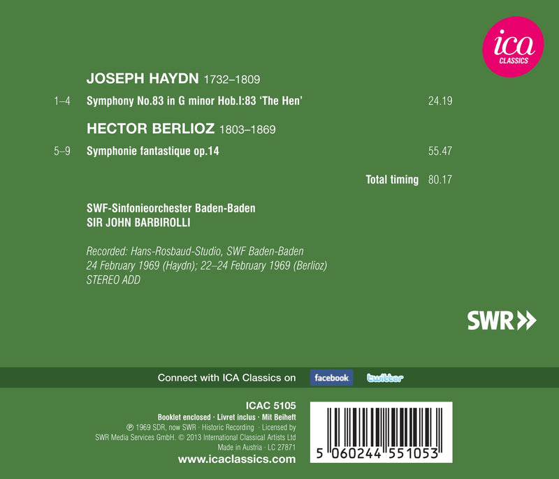 On SaleICA ClassicsHaydn: Symphony No. 83, 'The Hen' - Berlioz: Symphonie fantaBarbirolli made two earlier recordings of Berlioz's Symphonie fantastique in 1947 (mono) and 1958 (early stereo), both with the Halle Orchestra. This...