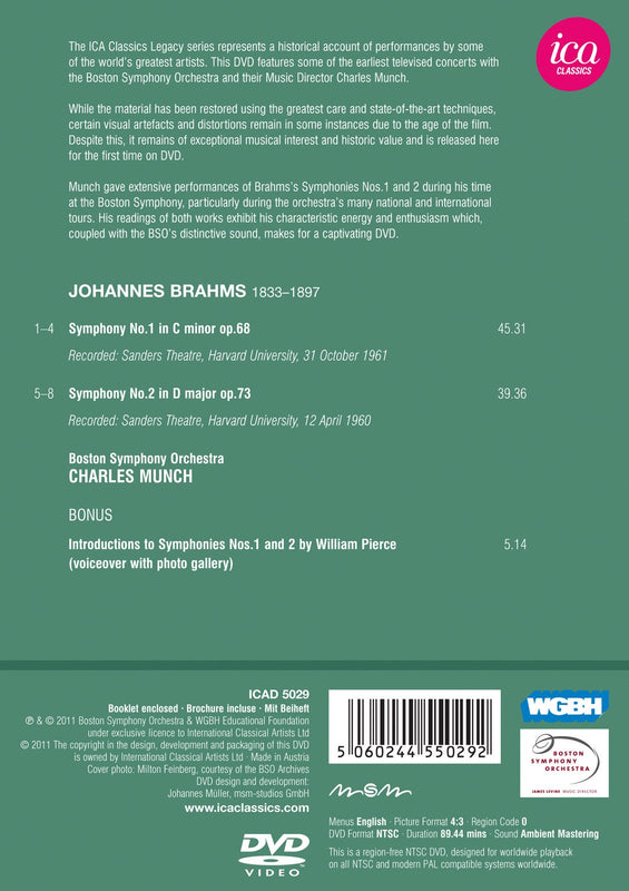 ICA ClassicsBrahms: Symphonies Nos. 1 and 2Charles Munch conducts the Boston Symphony Orchestra.