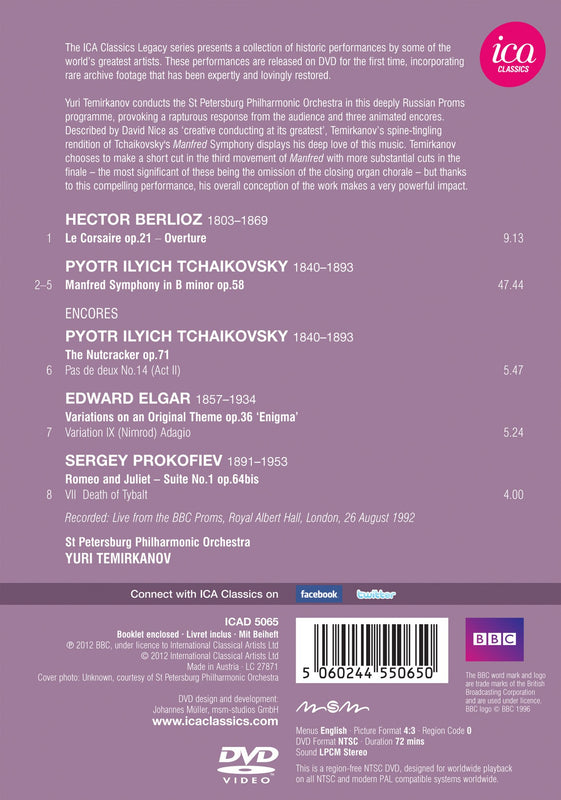 On SaleICA ClassicsYuri Temirkanov at the BBC PromsThis 1992 concert includes Tchaikovsky's Manfred; tghe Pas de Deux from Nutcracker Act 2; Elgar's "Nimrod" variation from the Enigma Variations and...