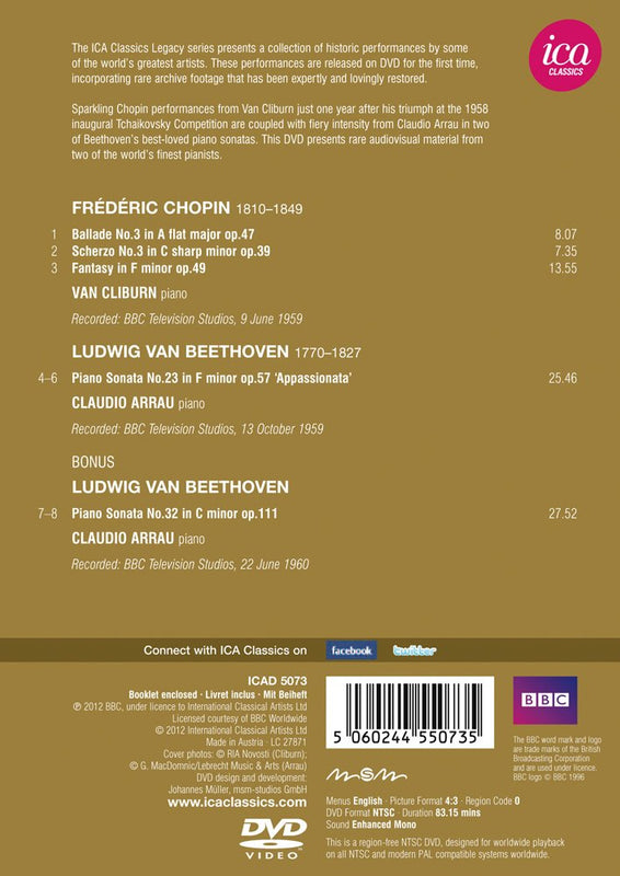 ICA ClassicsChopin: Fantasy in F minor - Ballade No. 3 - Beethoven: PianAs winner of the inaugural Tchaikovsky Competition in 1958, Van Cliburn was lauded by the greats, including Shostakovich, Gilels and Sviatoslav Richter,...