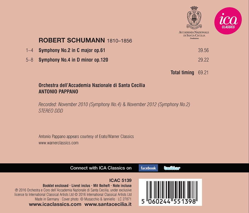 ICA ClassicsSchumann: Symphonies Nos. 2 & 4 (Live)This is the first recording of Antonio Pappano conducting two of Schumann’s most popular symphonies, No. 2 in C major and No....