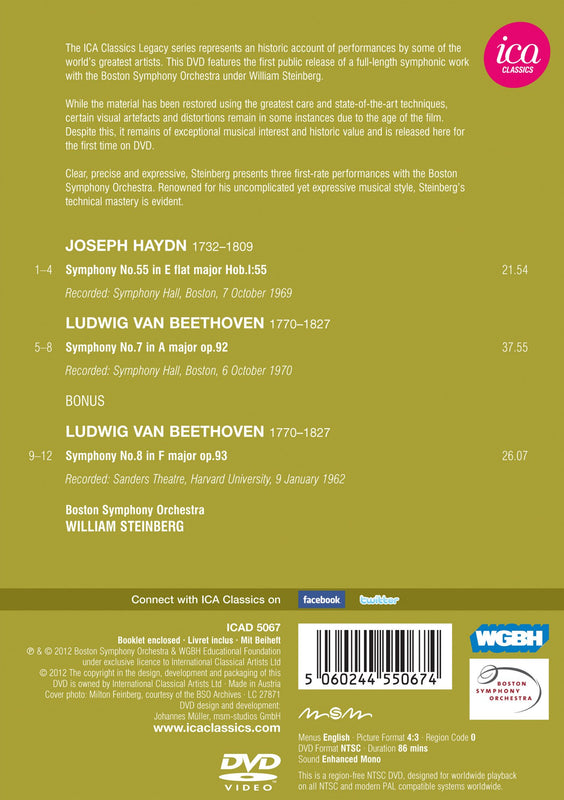 ICA ClassicsHaydn: Symphony No. 55 - Beethoven: Symphonies Nos. 7 & 8William Steinberg conducts the Boston Symphony Orchestra. This rare material, filmed in color, represents some of the earliest televised concerts with of...