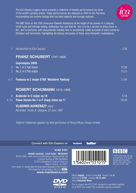 On SaleICA ClassicsSchubert: Piano Pieces, D. 946 - Wanderer Fantasy - SchumannCaptured at the BBC's Glasgow Studios in 1987 for their Music in Camera series, Ashkenazy demonstrates his versatility and musical skill through...