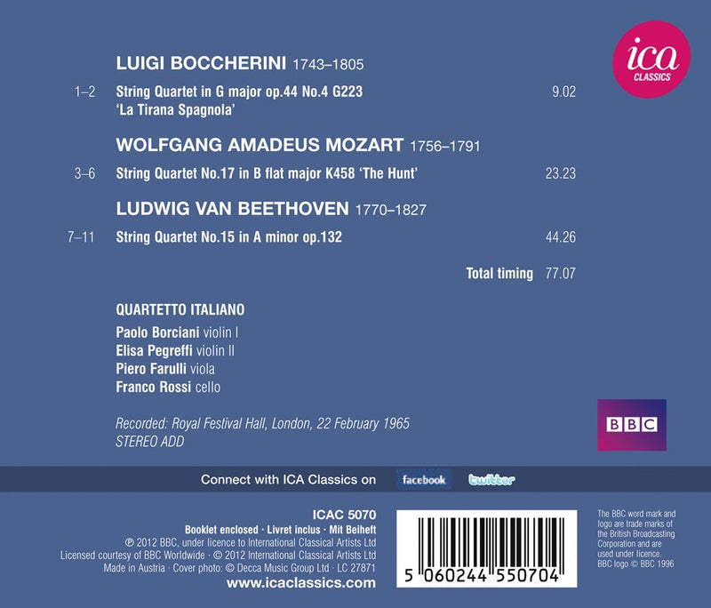 On SaleICA ClassicsBoccherini, Mozart & Beethoven: String QuartetsThe Quartetto Italiano is regarded as one of the finest string quartets of the twentieth century. They were formed officially in 1945....