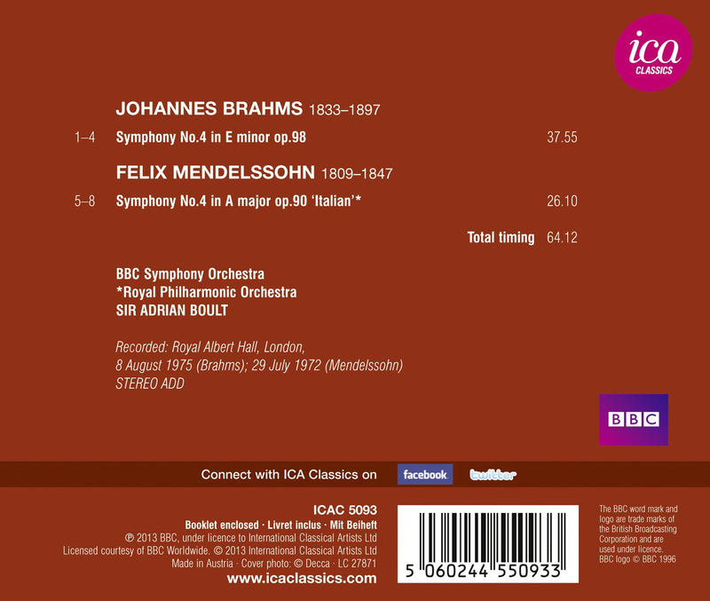ICA ClassicsBrahms: Symphony No. 4 - Mendelssohn: Symphony No. 4, "ItaliJust prior to the Second World War, Sir Adrian single-handedly built the BBC Symphony Orchestra into a world-renowned ensemble. This live 1975...
