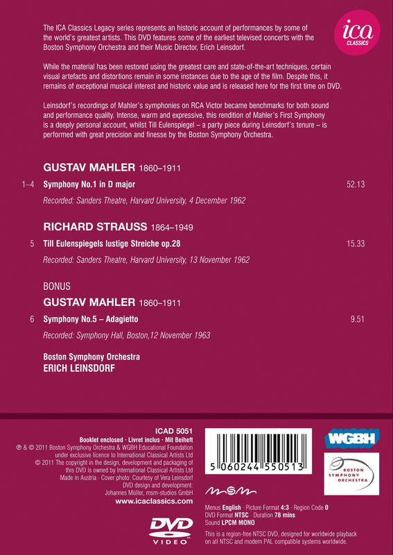 Erich Leinsdorf conducts the Boston Symphony Orchestra in works by Mahler and Strauss.