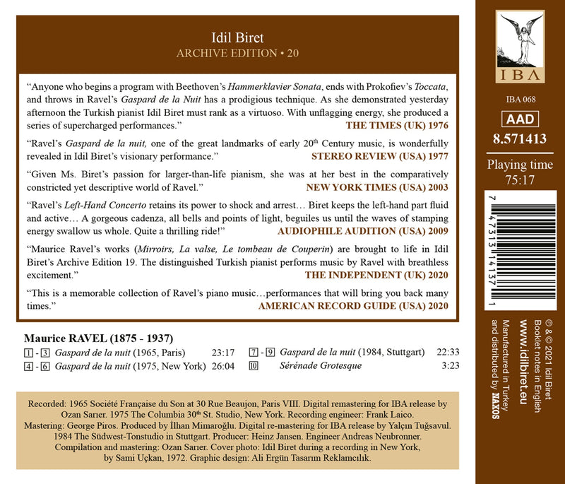 Though born in Turkey, Biret’s musical education was in France, where, as a child prodigy, she became the favourite pupil of the legendary mentor, Nadia Boulenger, her Ravel performances in the concert hall becoming a benchmark of good taste. If we turn the clock back to 1965, when she was twenty-four, and living in Paris, we find Decca, having bought out the French label, Vega—with whom Biret had a contract—offering her studio time to make two discs. The sessions were to include, Gaspard de la nuit, one of the first works she placed in her concert repertoire, and was intended for release on one LP. Sadly the test pressing showed the quality of the sound had fallen short of her expectations, and it was agreed not to publish it, the acetate masters being left with Biret. In recent times, those working in the new technological world expressed the possibility of restoring it to a quality that could prove acceptable to her. That included Mark-Obert Thorn, who has been responsible for a whole raft of restored discs from the 1960’s, many appearing on the Naxos Historic Label. It had to be as a ‘best endeavour’ release, though it does allow us to hear her youthful picture of water in the opening Ondine, where she closely follows the indications in the printed score. Ten years later, and now in New York, it seems to flow more naturally from her fingers, but it is the second, and pivotal picture of Le gibet, the difference is most noticeable. It is the picture of the dead body swinging from the gallows, that her first account has it metronomic evenness, while much slower in 1975, Biret is more intent on capturing the gruesome scene, which she chillingly achieved. Now we reach the beautiful sound of 1984, and in this final instalment we can add together all of the many virtues she has brought to the work in sound worthy of her performance.