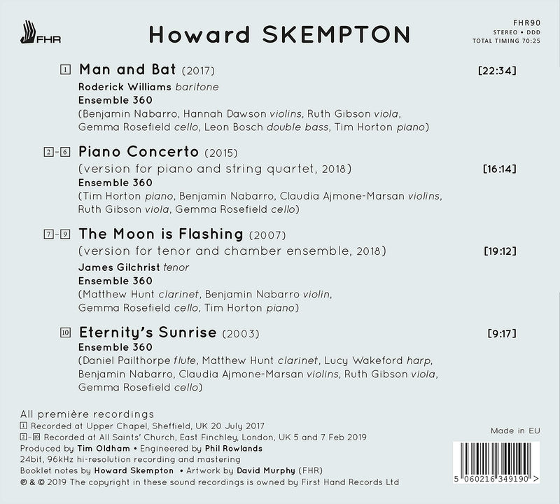 First Hand RecordsSkempton: Man & Bat, Piano Concerto, The Moon Is Flashing, Eternity's Sunrise / Ensemble 360Howard Skempton was born in Chester in 1947 and has worked as a composer, accordionist and music publisher. He studied in London...