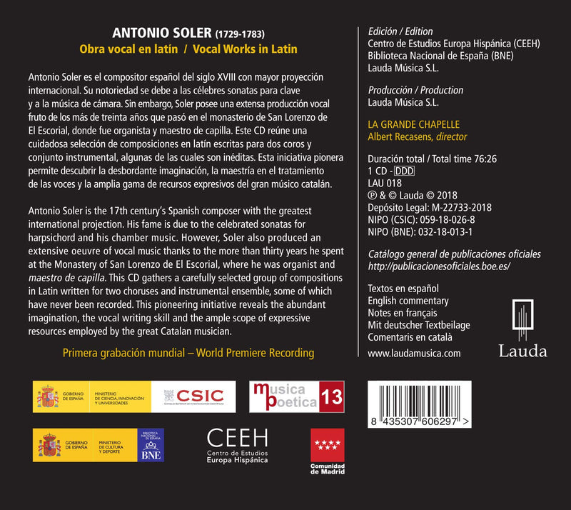 LaudaSoler: Obra vocal en latin / Recasens, La Grande ChapelleAntonio Soler is the 17th century’s Spanish composer with the greatest international projection. His fame is due to the celebrated sonatas for...