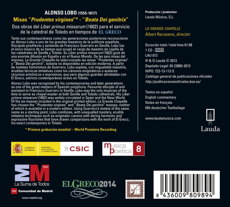 LaudaAlonso Lobo: Misas Prudentes Virgines; Beata Dei GenitrixA. LOBO Missa Prudentes virgines. Missa Beata Dei genitrix. GUERRERO Prudentes virgines. Beata Dei genitrix • Albert Recasens, dir; La Grande Chapelle...