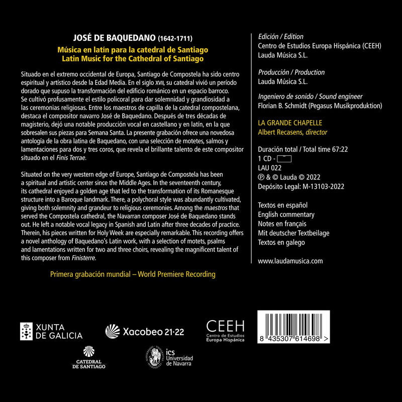 LaudaBaquedano: Musica para la catedral de Santiago / Recasens, La Grande ChapelleSituated on the very western edge of Europe, Santiago de Compostela has been a spiritual and artistic center since the Middle Ages....