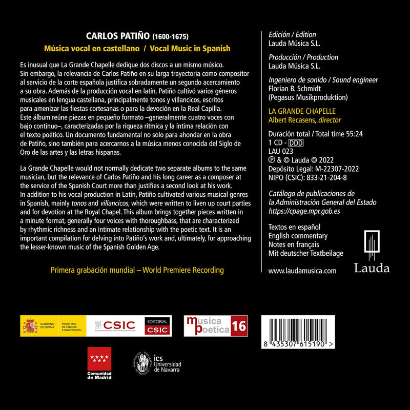 LaudaPatino: Musica Sacra Para La Corte / Recasens, La Grande ChapelleFor over thirty years Carlos Patiño served Philip IV as Choirmaster in the Spanish Royal Chapel. The Spanish monarch was not the...