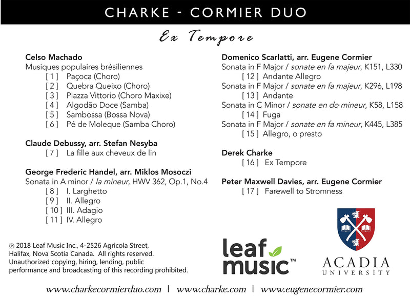 Ex Tempore is the debut album from the Nova Scotia-based Charke-Cormier duo. Derek Charke and Eugene Cormier have curated a charming program...