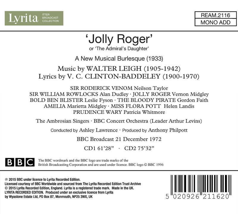 Jolly Roger or The Admiral’s Daughter is a comic opera in three acts with music by Walter Leigh, lyrics by V. C....