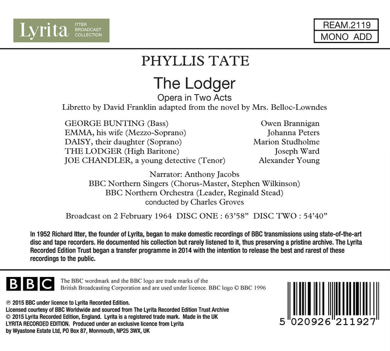 This two disc set is a BBC recording that was broadcast on February 2, 1964 of Phyllis Tate’s The Lodger, an opera...