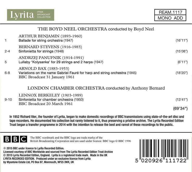 This lovely recording includes works for strings by Aurthur Benjamin (1893-1960), Bernard Stevens (1916-1983), Andrzej Panufnik (1914-1991), Arnold Bax (1883-1953), and Lennox...