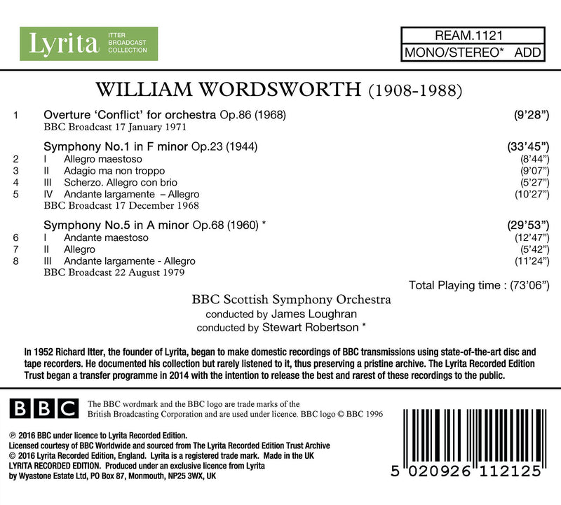These recordings of orchestral works by William Wordsworth (1908-1988) are all performed by the BBC Scottish Symphony Orchestra conducted by James Loughran...