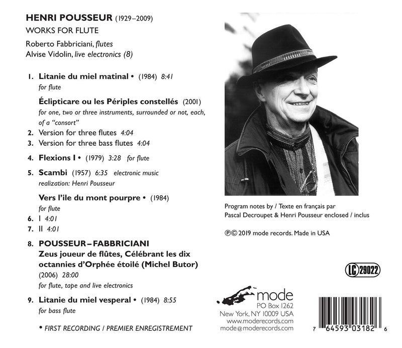 Flutist Roberto Fabbriciani continues his releases dedicated to the flute repertoire of single composers with works by Belgian composer Henri Pousseur (1929-2009)....