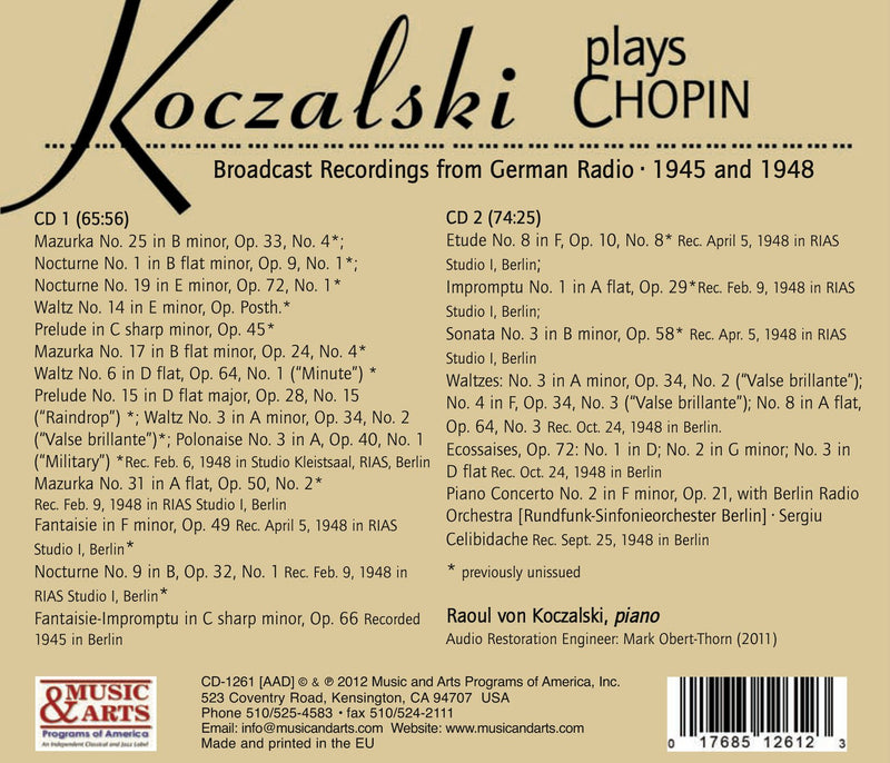Music and Arts Programs of AmericaKoczalski Plays Chopin: Broadcast Recordings From German Radio 1945 & 1948