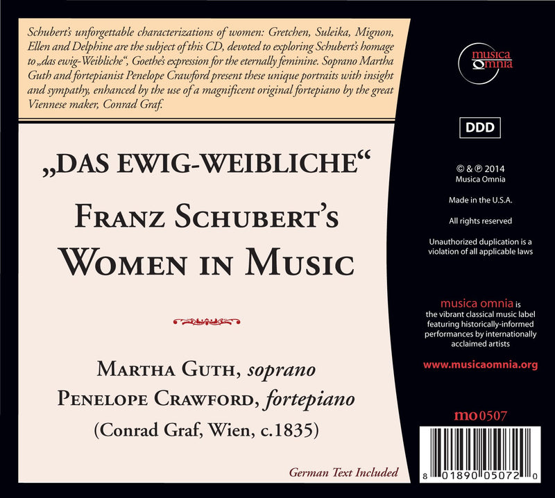 Musica OmniaThe Romantics, Vol. 20: Das Ewig-Weibliche - Franz Schubert'Schubert's unforgettable characterizations of women: Gretchen, Suleika, Mignon, Ellen and Delphine are the subject of this CD, devoted to exploring Schubert's homage...