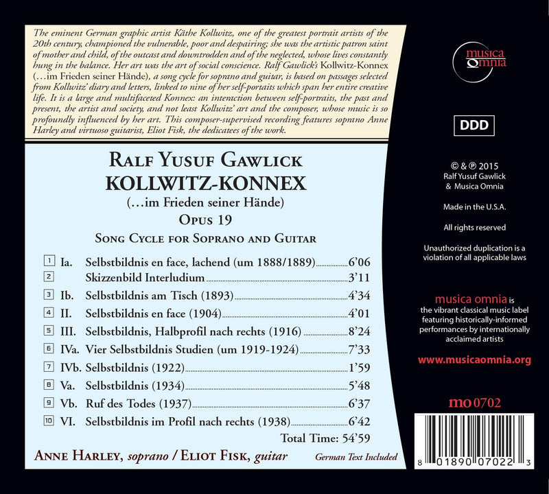 Musica OmniaRalf Yusuf Gawlick: Kollwitz-Konnex (...im Frieden seiner HäThe eminent German graphic artist Käthe Kollwitz, one of the greatest portrait artists of the 20th c., championed the vulnerable, poor and...