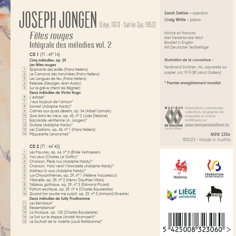 Musique en WallonieJongen: Fêtes rouges (The Complete Mélodies, Vol. 2) / Defrise, WhiteJoseph Jongen is universally considered one of the major Belgian composers of the 20th century. The 150th anniversary of his birth, celebrated...