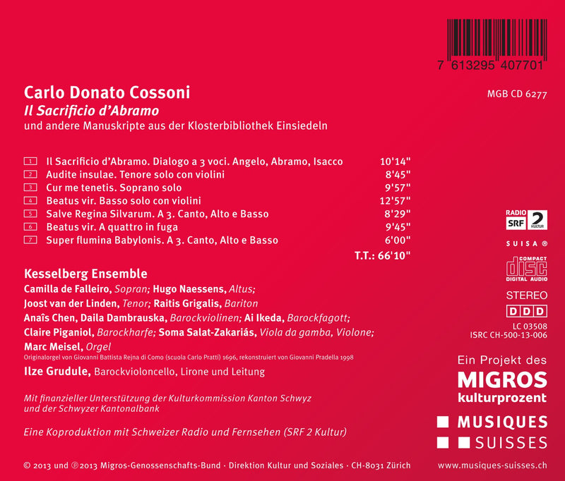Musiques SuissesCossoni: Il Sagrificio D'abramo• First recording of the works of 17th century composer Carlo Donato Cossoni • Features the Kesselberg Ensemble with Ilze Grudule •...
