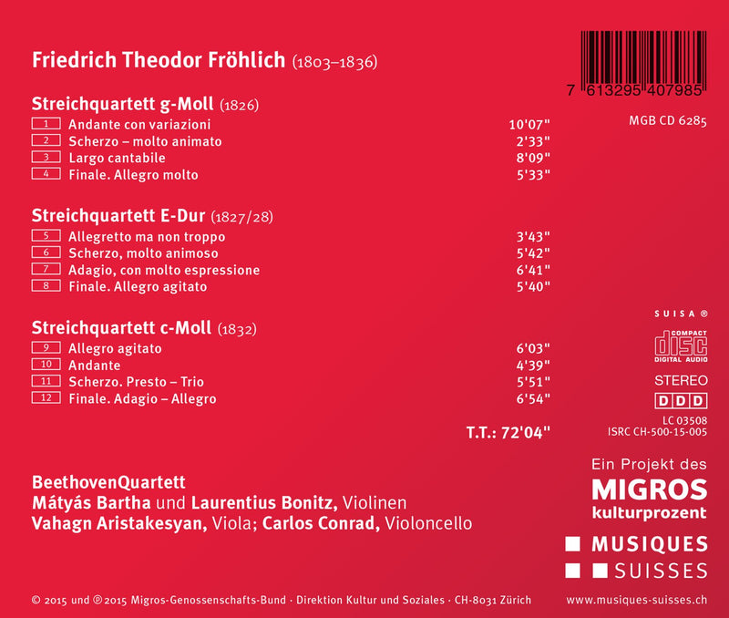 Musiques SuissesFröhlich: String QuartetsThis new release from Musiques Suisses includes the three string quartets by composer Friedrich Theodor Froehlich. The Beethoven Quartet is premiering his...