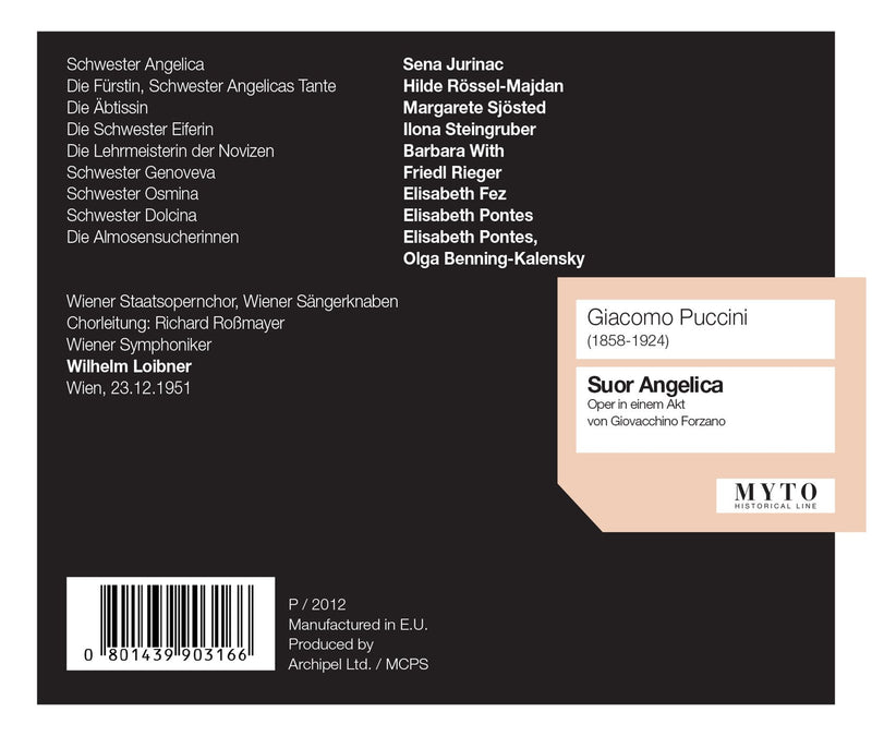MYTO HistoricalPuccini: Suor AngelicaThe Giacomo Puccini opera Suor Angelica is presented on this new release by MYTO Historical. Recorded on December 23, 1951, this recording...