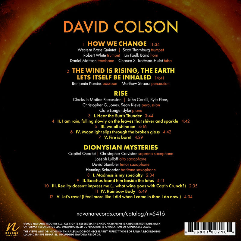 On RISE: MUSIC IN TIMES OF UNCERTAINTY, composer David Colson employs conventional and innovative chamber combinations alike to express a wide array...