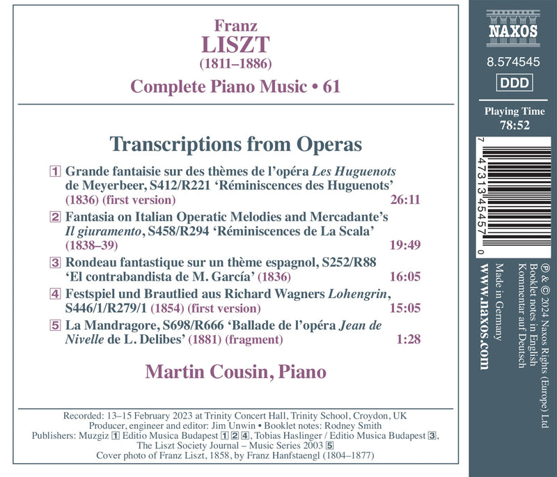 Volume 61 of Naxos’s acclaimed Liszt Complete Piano Music edition features opera transcriptions from Les Huguenots, Il giuramento, Lohengrin and Jean de...