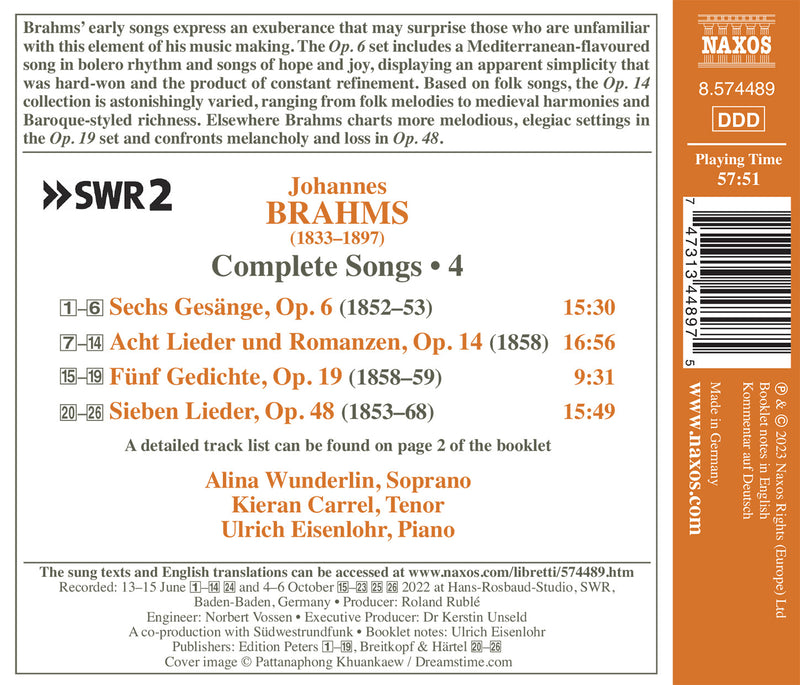 Ulrich Eisenlohr’s critically acclaimed series of Brahms’ complete songs reaches its fourth volume and features the Opp. 6, 14, 19 and 48...