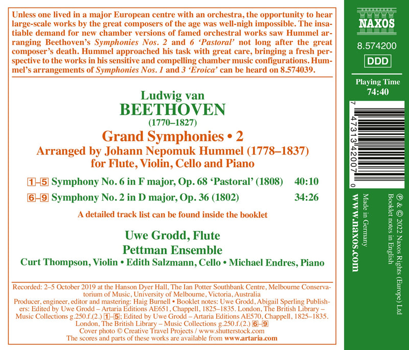 NaxosBeethoven: Symphonies vol. 2 - Nos. 2 & 6 (for piano trio & flute) / Grodd, Pettman Ensemble