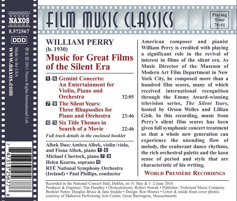 Of course there were no soundtracks for films of the silent era. Music was provided, in situ, in cinemas, by pianists or small instrumental groups, and, very occasionally, by orchestras playing in large cinemas for important film premieres. Often the music played comprised odd snippets - frequently from well known classical compositions that fitted the locations, pace and mood of the on-screen action. Years later when these Silent Era classics were rediscovered, new original music was composed for them. Foremost amongst composers for silent films are Carl Davis – and William Perry. This Naxos CD is a celebration of Perry’s work.