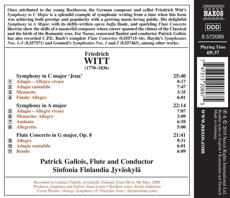 WITT Symphony in C, “Jena.” Symphony in A. Flute Concerto in G, op. 8 • Patrick Gallois (fl, cond); Sinfonia Finlandia Jyväskylä • NAXOS 8.572089 (69:37)