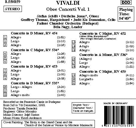 Selections recorded September to December, 1988. These performances are also included in a 5-disc set of Vivaldi concertos, Naxos 8-505013.