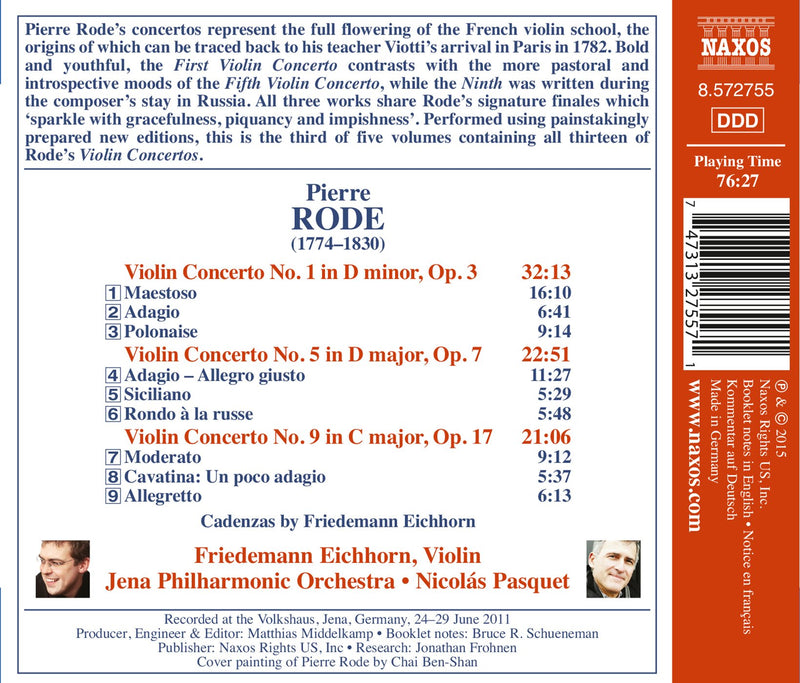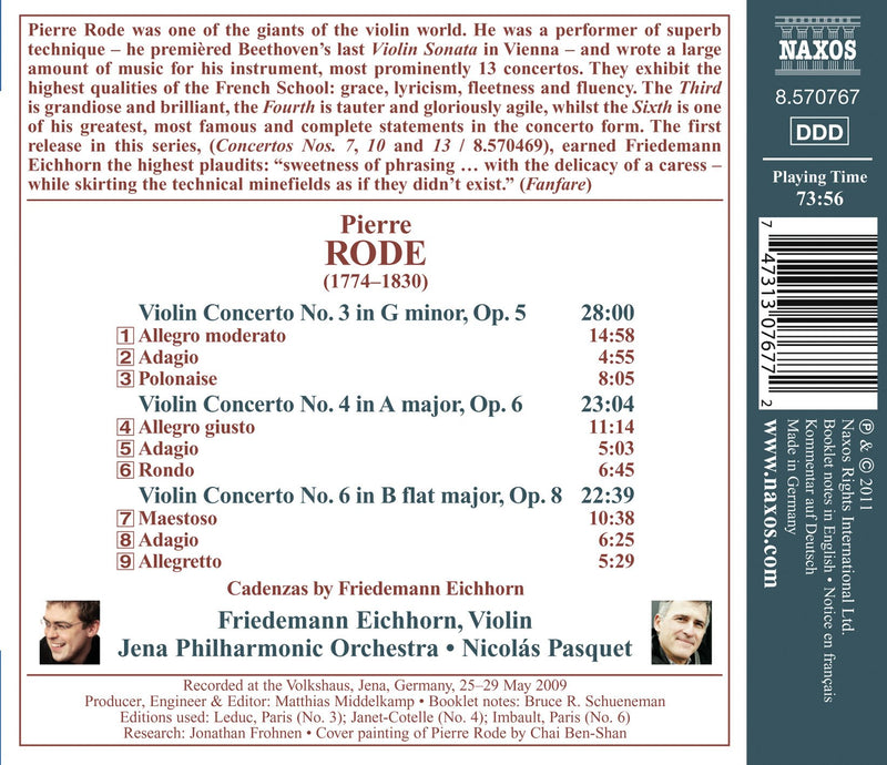 Pierre Rode was one of the giants of the violin world. He was a performer of superb technique—he premièred Beethoven’s last Violin Sonata in Vienna—and wrote a large amount of music for his instrument, most prominently 13 concertos. They exhibit the highest qualities of the French School: grace, lyricism, fleetness and fluency. The Third is grandiose and brilliant, the Fourth is tauter and gloriously agile, whilst the Sixth is one of his greatest, most famous and complete statements in the concerto form. The first release in this series, (Concertos Nos. 7, 10 and 13 / 8.570469), earned Friedemann Eichhorn the highest plaudits: “sweetness of phrasing…with the delicacy of a caress—while skirting the technical minefields as if they didn’t exist.” (Fanfare)