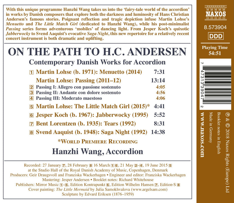With this unique programme Hanzhi Wang takes us into the ‘fairy-tale world of the accordion’ in works by Danish composers that explore both the darkness and luminosity of Hans Christian Andersen’s famous stories. Poignant reflection and tragic depiction infuse Martin Lohse’s ‘Menuetto’ and ‘The Little Match Girl’ (dedicated to Hanzhi Wang), while his post-minimalist ‘Passing’ series forms adventurous mobiles of dancing light. From Jesper Koch’s quixotic ‘Jabberwocky’ to Svend Aaquist’s evocative ‘Saga Night,’ this new repertoire for a relatively recent concert instrument is both dramatic and uplifting. Up and coming artist Hanzhi Wang is the accordion’s perfect ambassador. Praised for her engaging stage presence and performances that are technically and musically brilliant, her career has already taken her around the globe with performances in Europe and Asia.