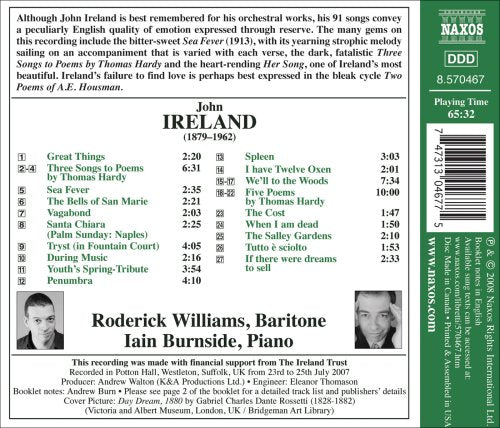 Although John Ireland is best remembered for his orchestral works, his 91 songs convey a peculiarly English quality of emotion expressed through...