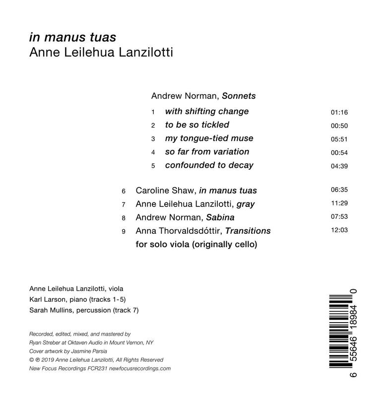 New Focus RecordingsAnne Leilehua Lanzilotti: in manus tuasViolist Anne Lanzilotti releases her debut solo album, focusing on the art of transcription, with repertoire by Caroline Shaw, Andrew Norman, Anna...