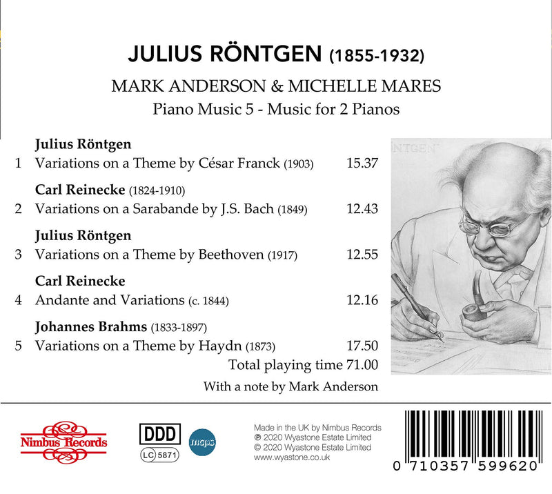 This recording offers the listener an interconnected view of romantic and postromantic repertoire for two pianos, much of it unknown and even unpublished, until now. The best-known work here is Brahms' Variations on a Theme by Haydn, Op.56b but there are other works included that deserve wider circulation and exposure. The two sets of variations by Carl Reinecke (1824-1910) are exquisite examples of 2-pianowriting and exhibit attractive traits of the Leipzig School, at times providing strong echoes of Schumann and J.S. Bach, quite overtly in his Variations on a Sarabande by J.S. Bach. Likewise, the two sets of previously unpublished works by Julius Rontgen (1855-1932), whose early works are well-rooted in that same Leipzig School, reveal a mastery of composition in the 2-piano genre, an area in which he is currently unknown. Chamber music, concerti and even symphonies, alongside the growing popularity of his solo piano music, are well known genres for Rontgen. However, this recording presents R�ntgen's debut as a composer in the 2-piano medium. In our opinion, his success is as astounding as the obscurity of these works is bewildering.