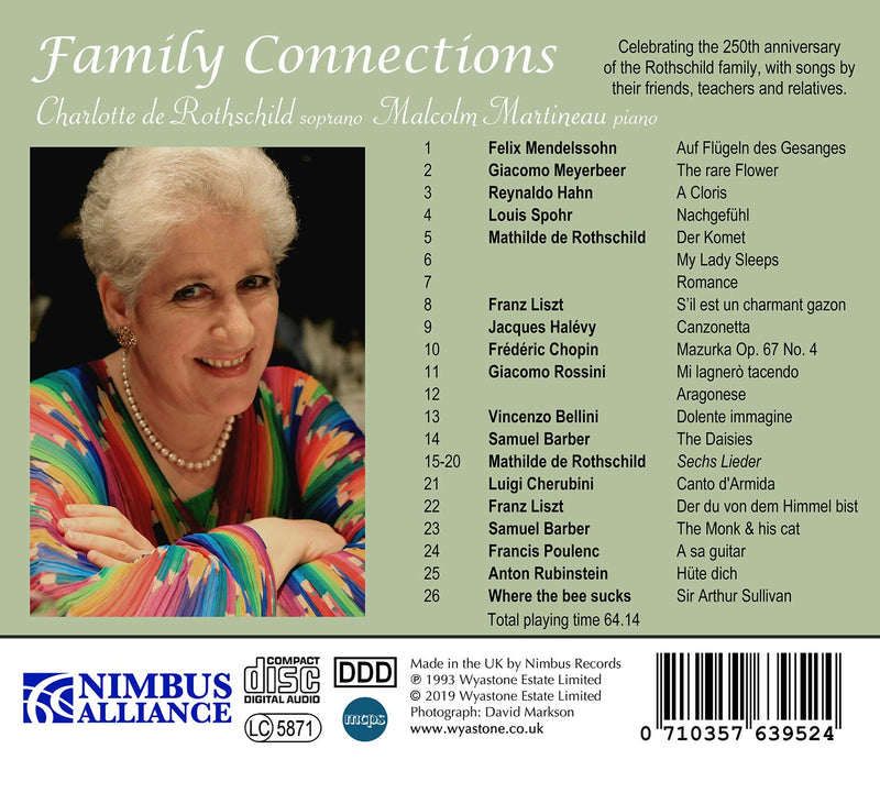 Family Connections celebrates the 250th anniversary of the Rothschild family, with songs by their friends, teachers and relatives. Charlotte de Rothschild's career...