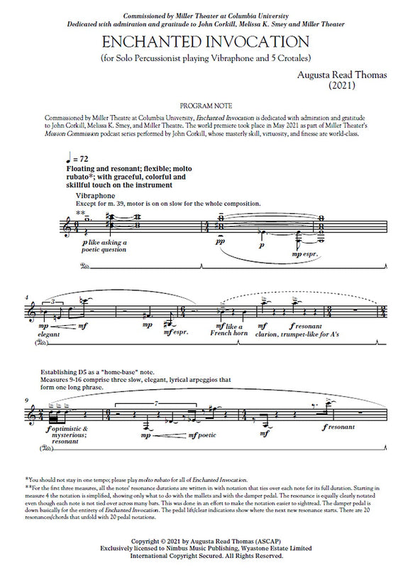 Enchanted Invocation is a work for solo percussionist playing vibraphone and 5 crotales. Augusta Read Thomas writes: "I love composing. In a...