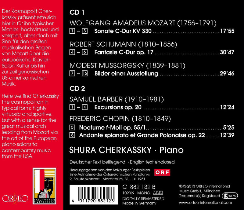 In the concert documented on this CD, Shura Cherkassky follows a well-proportioned interpretation of Mozart's Sonata K 330 with Schumann's C major...