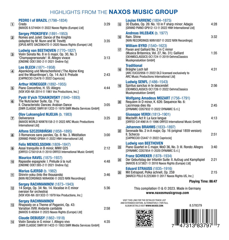 The sampler CD includes recordings from the Naxos main label as well as many of the group's global family of affiliates, with performances by Leonard Slatkin, Boris Giltburg, JoAnn Falletta, Christian Tetzlaff, Lars Vogt, Daniel Müller-Schott, Walter Klien, and more.
